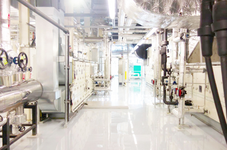 Ausbau – Reinräume, Lager- und Produktionsbereiche, hochwertige Fußböden, Trockenbauwände, Unterhangdecken mit hohen Anforderungen / Reinraumbedingungen, Stützen- und Wandverkleidungen, z.T. Anfahrschutz, Edelstahltreppen im Reinraumbereich, Stahl Pipe Racks zur hochkomplexen Leitungsverlegung im Innenraum mit hoher Belegungsdichte