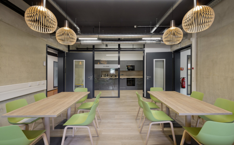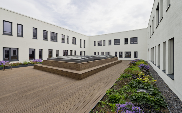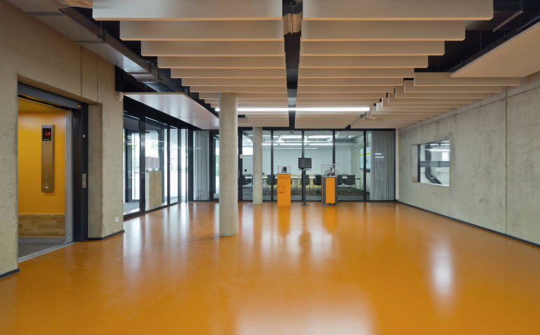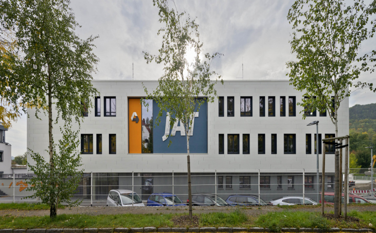 Das Werkgelände der Antriebstechnik Jena GmbH (JAT) wurde um ein neues Verwaltungs- und Produktionsgebäude erweitert. Der Technologiekomplex bietet der JAT beste Voraussetzungen, um zukünftig noch schneller auf die Nachfrage nach kundenspezifischen Antriebslösungen zu reagieren. Neben Produktions- und Lagerflächen zeichnet sich der Innenraum durch eine flexible Bürowelt aus. Diese bietet Flächen für die Einzel- und Teamarbeit sowie Loungebereiche und moderne Entwicklungslabore. Im zweiten und dritten Obergeschoss wurden die Außenwände in Holzrahmenbauweise errichtet, im Innenraum ist hier die Wandbekleidung aus OSB-Platten sichtbar. Im zweiten Obergeschoss befindet sich ein großzügiger Innenhof, der sowohl zum konzentrierten Arbeiten als auch zur Kontemplation genutzt werden kann. Helle Metallpaneele und anthrazitfarbene Putzfassaden prägen die äußere Erscheinung des Gebäudes. Rücksprünge im Erdgeschoss und ersten Obergeschoss erzeugen in Teilen eine schwebende Wirkung des zweiten und dritten Obergeschosses. Fenster in unterschiedlichen Größen und unregelmäßiger Anordnung erhöhen überdies die Spannung in der Fassade.