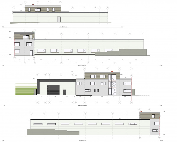 Entsprechend der Vorgabe des Bauherren ist eine vollständige Verlagerung der Produktion und der Verwaltung Ziel der Aufgabenstellung. Das vorgelagerte zweigeschossige Bürogebäude mit Staffelgeschoss dient repräsentativen Zwecken und beinhaltet die notwendigen Büro-und Sozialflächen für die Mitarbeiter wie Umkleiden, Wasch- und WC Räume sowie die Aufenthaltsbereiche.