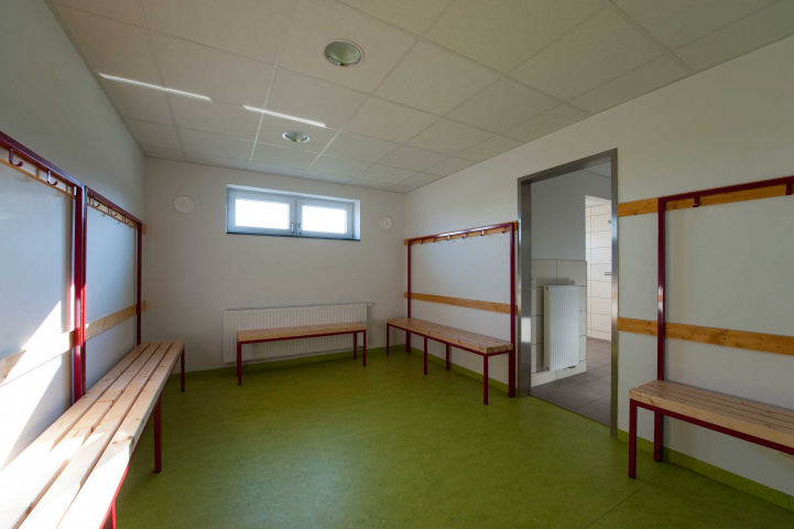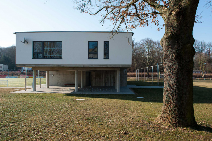 Der Neubau ist in zwei Gebäudeteile gegliedert. Im westlichen Gebäudeteil untergebracht sind Umkleiden und Sanitäreinrichtungen für die Sportler sowie Verwaltungsräume. Im östlichen Gebäudeteil sind ein Vereinsraum incl. öffentlichem Sanitärbereich vorgesehen. Verbunden sind beide Gebäudeteile durch einen offenen Zugang. Über diesen wird das Gebäude erschlossen. Um das Gebäude auch für Rollstuhlfahrer nutzbar zu machen, ist für die Treppe im Zugang ein Treppenlift geplant.