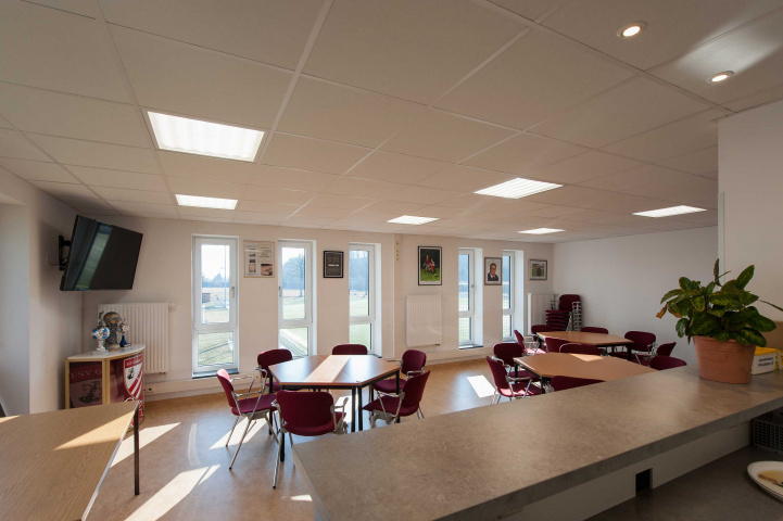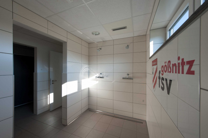 Um die Privatsphäre der Spieler zu schützen sind für die Umkleiden und Duschen schmale Doppelflügelfenster mit einer Brüstungshöhe von 1,70m geplant. Um im Vereinsraum eine weitläufige Aussicht sowie eine optimale Belichtung zu erzielen wurde die Giebelwand großflächig verglast. In den übrigen Räumen sind schmale hochformatige Fenster mit einer Brüstungshöhe von 0,30m geplant.
