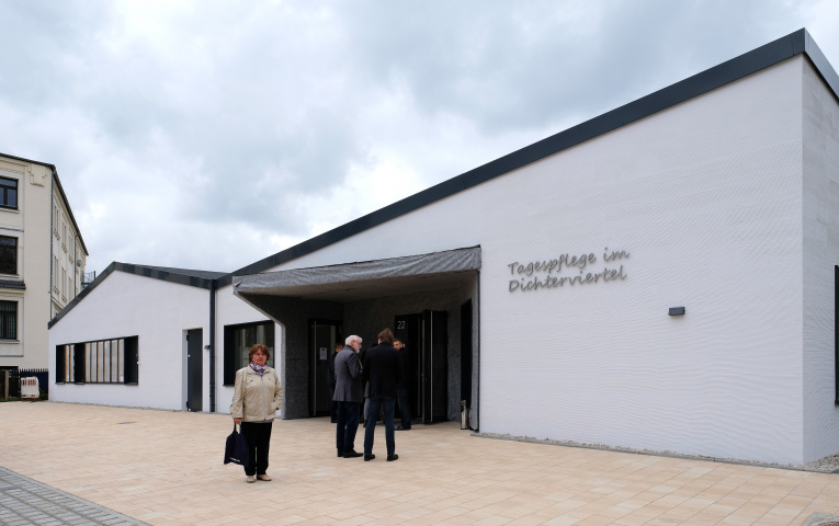 Mit der neugebauten Tagespflegeeinrichtung in der Altenburger Kleiststraße entstand für 26 Pflegebedürftige ein modernes Gebäude mit markant gefalteter Dachform. Als Blickpunkt im Inneren sticht das Schwesternzimmer als zentraler Punkt hervor. Der Werkraum bietet viele Möglichkeiten zur Beschäftigung der Senioren. Zu Aufenthalten im Freien lädt ein großzügiger Innenhofbereich mit Terrasse ein. Im Objekt befinden sich weiterhin ein Pflegebad, ein Friseursalon sowie eine 3-Raumwohnung. Das Objekt ist von den angrenzenden Parkstellflächen barrierefrei zu erreichen.