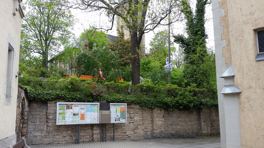 Erst mit dem Bau der Erfurter Straße, heute B 7, erfolgte die räumliche Trennung der namensgebenden St. Johanniskirche von ihrem Friedhof. Mit dem Ansteigen des Verkehrsaufkommens wuchs auch die Lärm- und Schadstoffbelastung, was zu einer Entwertung der ehemaligen Friedhofs- und heutigen Grünfläche oberhalb der katholischen Pfarrkirche geführt hat. So war es Ziel einer Vorplanung von Dipl. Ing Gerald Schröder, Jena und Carsten Grobe aus dem Jahr 2016 die historische Verbindung über eine große Treppenanlage und einen markierten Überweg über die Erfurter Strasse wieder herzustellen.