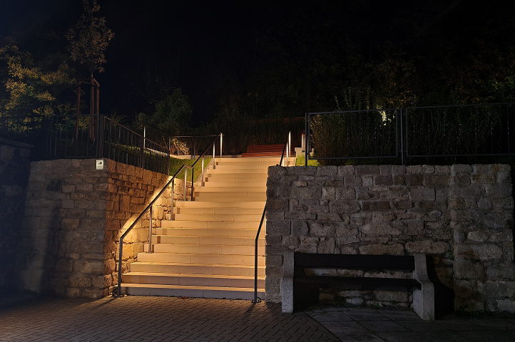 Die Öffnung der ehemaligen Mauer wertet den Kirchvorplatz erheblich aúf und gibt den Blick frei auf den Turm der Friedenskirche. Eine in die Handläufe der Treppe integrierte indirekte LED Beleuchtung inszeniert die neue Treppenanlage auch in den Abendstunden.