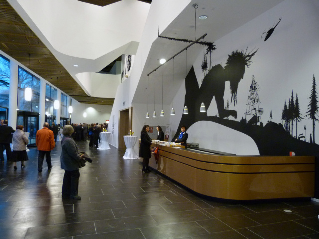 Die Fassade wird durch eine großflächige Verglasung im Eingangsbereich einladend geöffnet. Weitere großformatige Fensterausschnitte definieren die jeweiligen öffentlichen Bereiche im Gebäude.