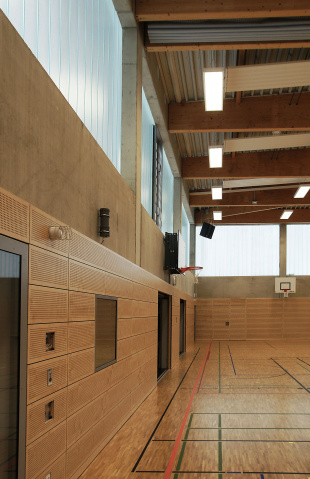 Durch bereits erfolgte Erweiterung des Gymnasiums musste eine neue Lösung für die gestiegenen Ansprüche geschaffen werden. Eine bereits bestehende Einfeldhalle aus der DDR- Zeit kann die Anforderungen an neue Sportstätten nicht mehr erfüllen. Da die alte Halle auch kapazitätsmäßig unzureichend war, wurde der Neubau einer Zweifeldhalle angestrebt. Hier entstand nun ein moderner Bau mit teilbarer 990 m² großer Sportfläche, angelagertem Gymnastikraum und voll ausgestatteter Sanitär- und Nebenraumspange. Das Gebäude besteht aus einem hellen monolithisch anmutendem Grundkörper und einem transparenten Aufsatz aus Profilglas. Ziel war die bestmögliche Ausnutzung von natürlichem Licht für den täglichen Sportunterricht. Der Innenraum der Halle ist geprägt von natürlichen Materialien und Farbtönen.