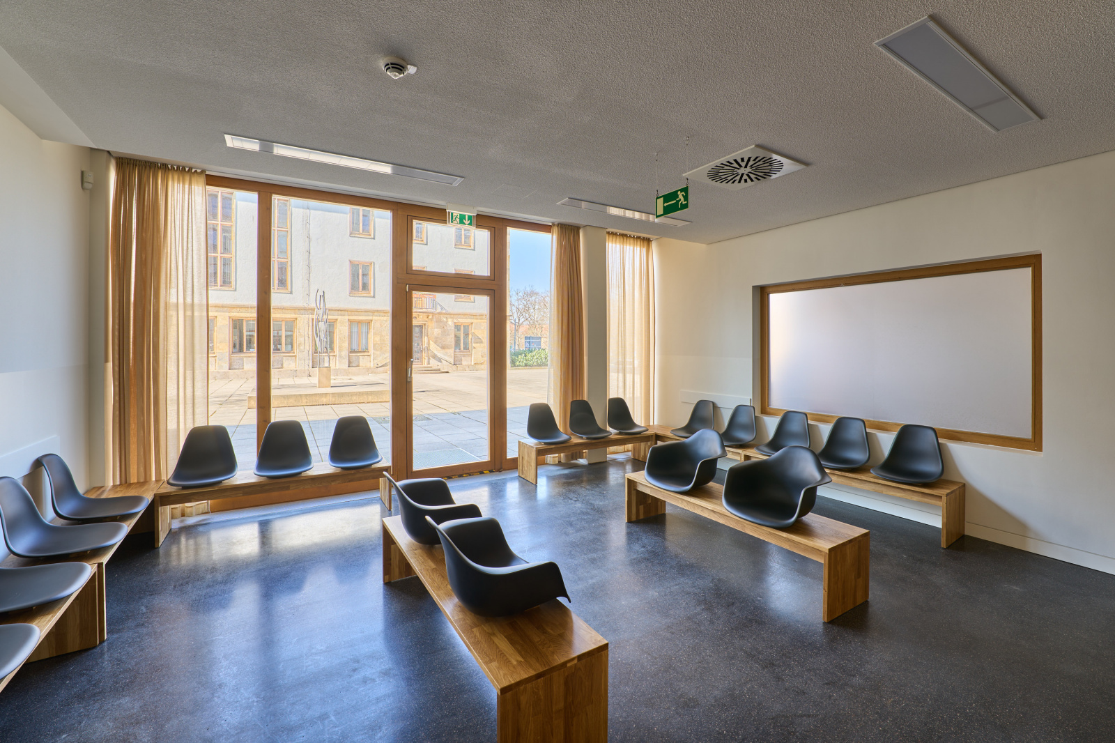 Der angrenzende Wartebereich ist übersichtlich zoniert, bietet unterschiedliche Aufenthaltsqualitäten und unterstützt durch seine ruhige Gestaltung einen angenehmen Aufenthalt.