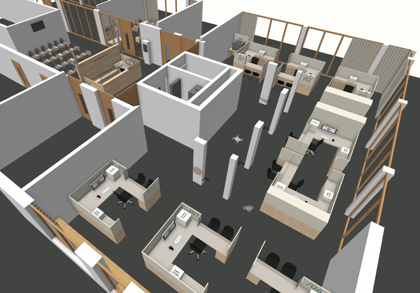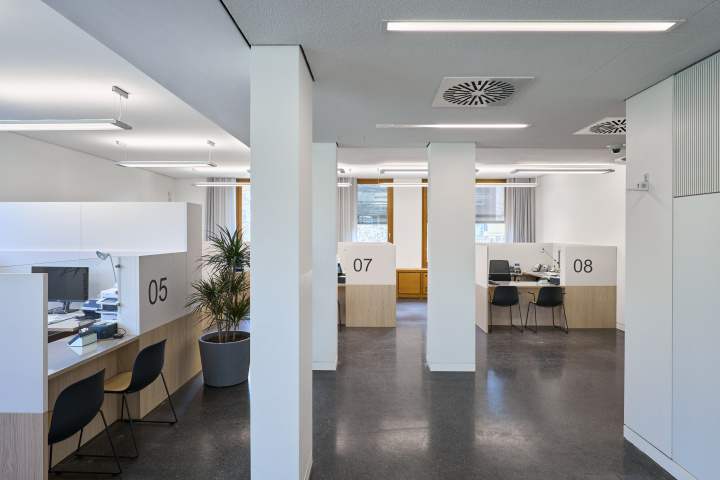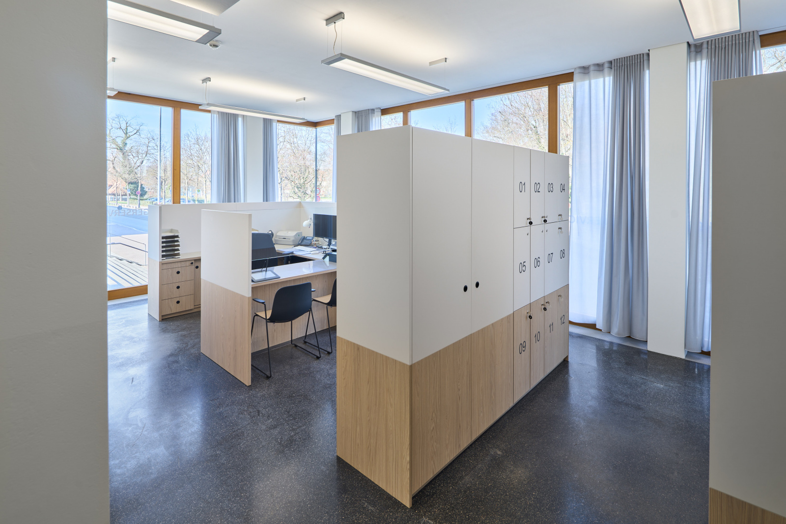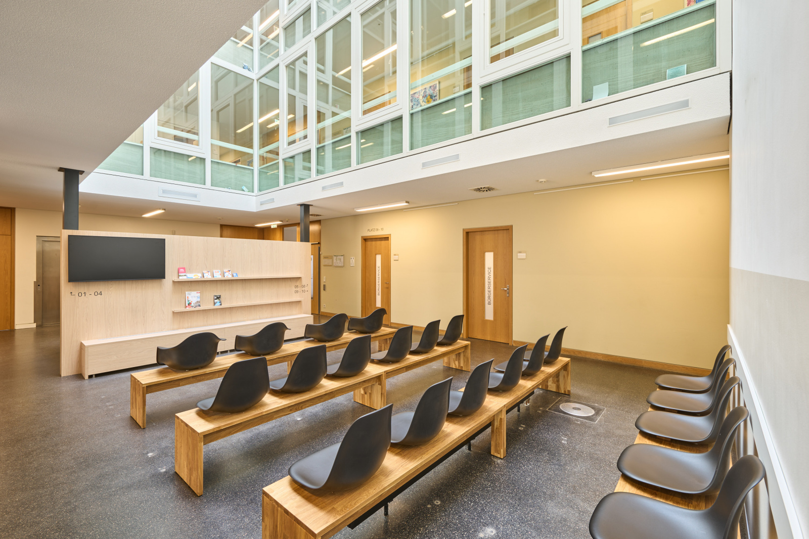 Die Räumlichkeiten des Bürgerservices mit acht Beratungsplätzen schließen daran an und lassen diskrete Beratungssituationen entstehen. Pausen- und Organisationsbereiche für die Mitarbeitenden sind funktional eingebunden, sodass effiziente Abläufe im Hintergrund gewährleistet werden.