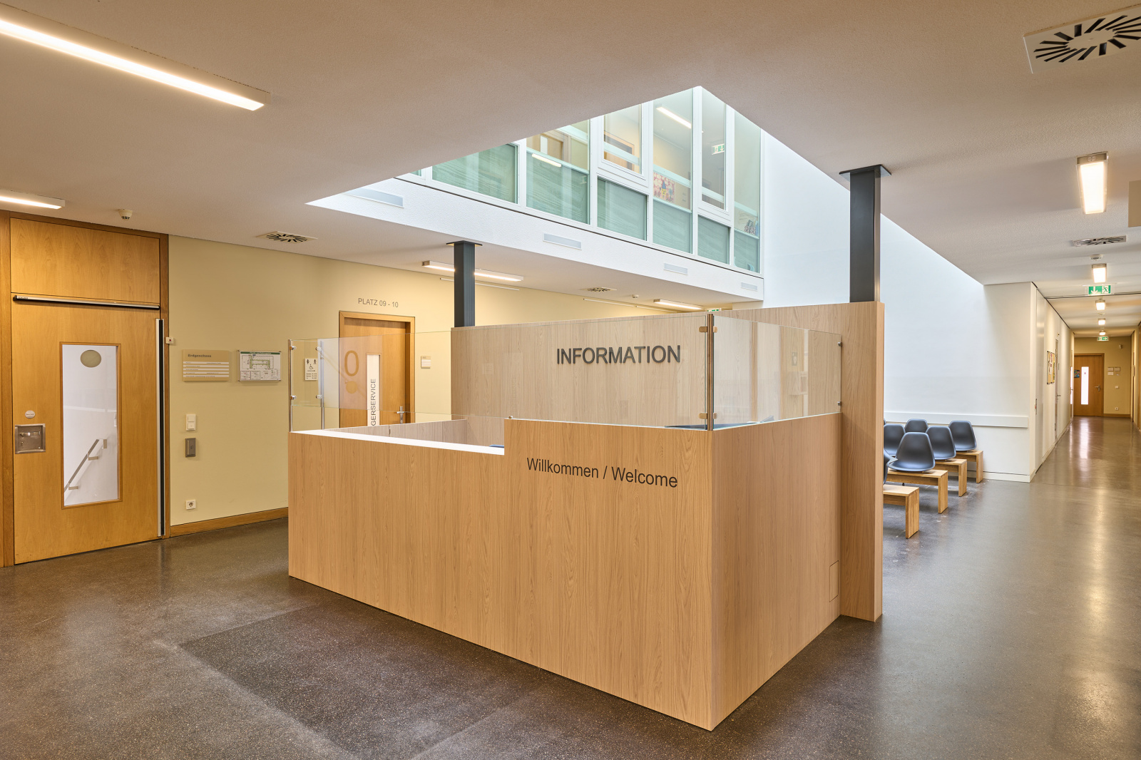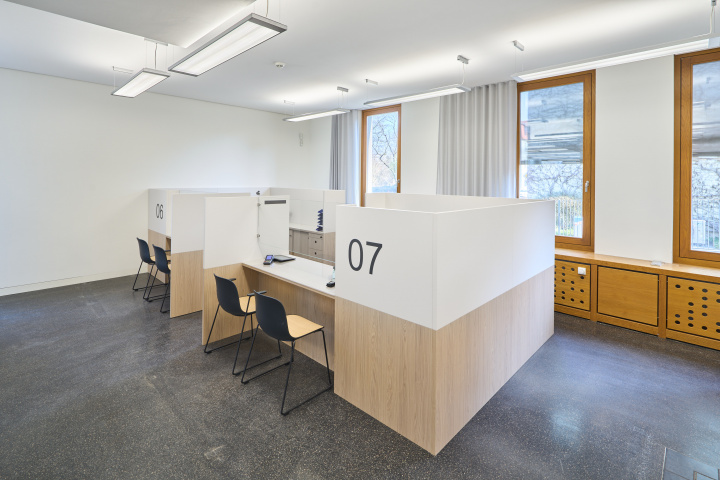 Hochwertige Holzoberflächen und abgestimmte warme Grautöne fügen sich zurückhaltend in den Bestand ein und verleihen dem Bürgerzentrum ein helles, freundliches und aufgeräumtes Erscheinungsbild.