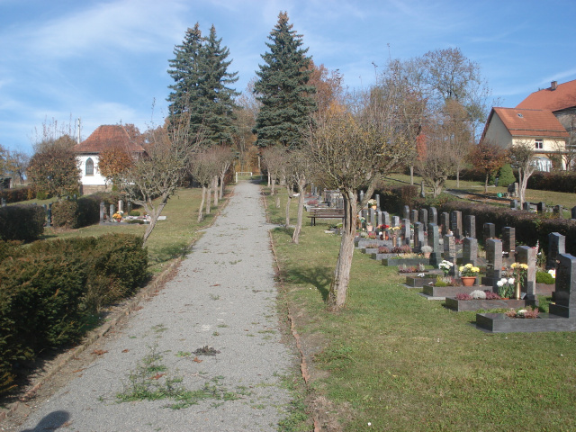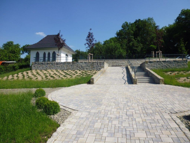 Da die Neigung des Gesamtgeländes nicht zu verändern war, wurde der Zugang verlegt. Man gelangt nun seitlich -aus Richtung des Dorfes- auf das Gelände. Hier wurden Rampen und flache Treppenanlagen angelegt, so dass sowohl die Zufahrt als auch ein sicherer Zugang zum Vorplatz mit Friedhofshalle und den Grabflächen gewährleistet ist.