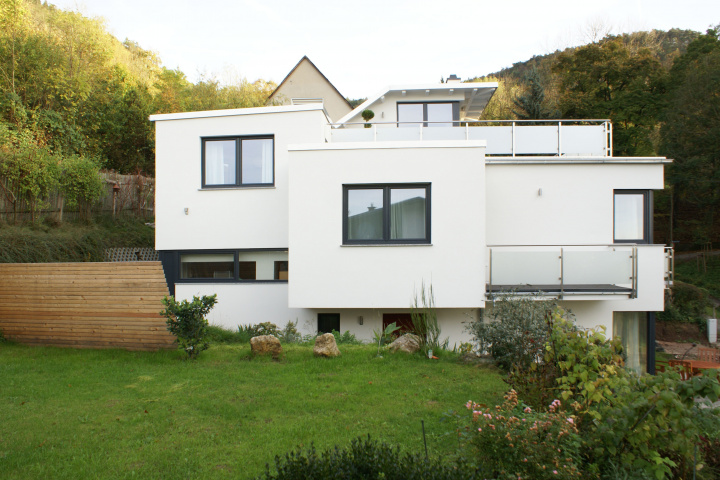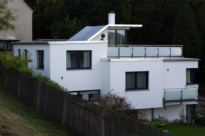 Hauptanliegen bei der Planung des Einfamilienhauses mit Einliegerwohnung war die optimale Einordnung des Gebäudes in die Hangsituation unter Beachtung der Belichtung der Hauptwohnbereiche, welche nach Südwesten orientiert sind. Die Einliegerwohnung ist hangseitig erschlossen und ermöglicht den ungehinderten Talblick nach Westen. Beide Wohnungen haben Zutritt zur großzügigen Dachterrasse.