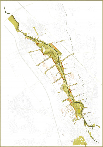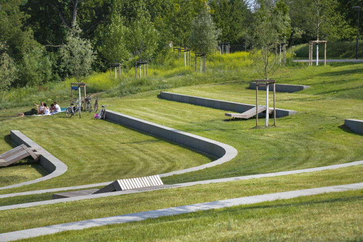 Abwechslungsreiche Spiel- und Sportanlagen wechseln sich ab mit attraktiven Gartenpartien. An den Siedlungsrändern vermitteln Parkterrassen zwischen der Stadt und dem Talraum. Der Fluss selbst wird durch attraktive Orte am Wasser erlebbar gestaltet.