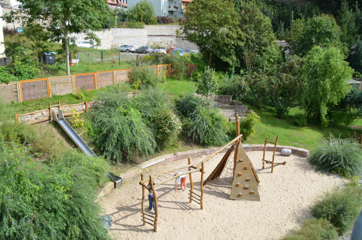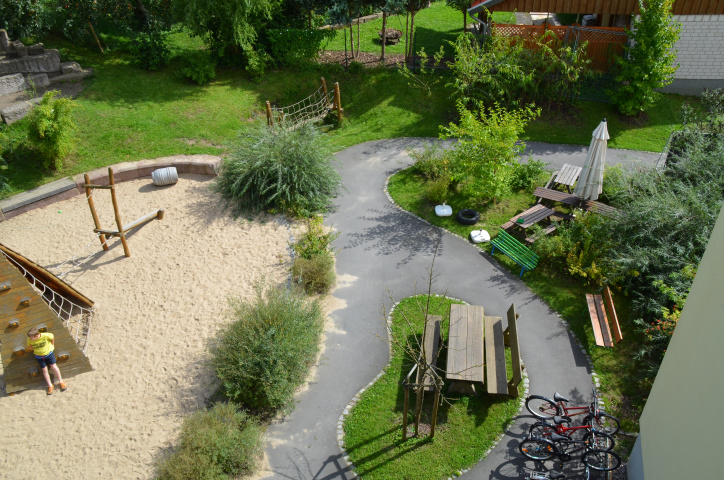Der neu hinzugekommene Osthang wird dabei als großzügig terrassierter Spielhügel nutzbar gemacht und mit niedrigen Weidenpflanzen gesichert. Im Süden des Gebäudes entstehen zudem drei Hochbeete, die den Kindern als Gemüsegarten dienen und eine Sensibilisierung für Anbau und Nutzung von Kulturpflanzen fördern soll.