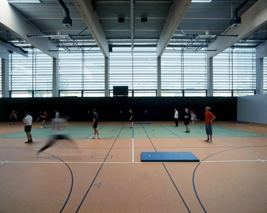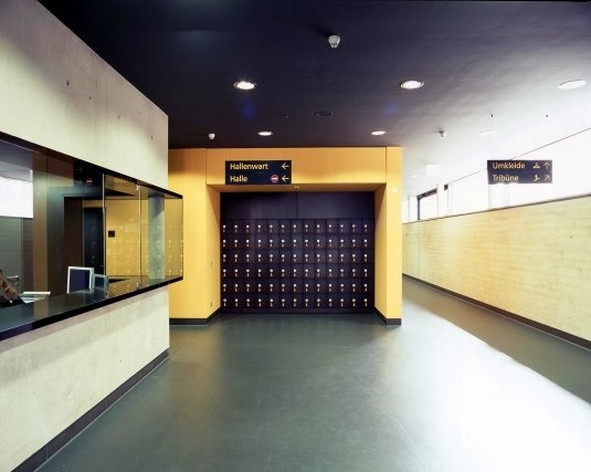 Die Halle gliedert sich in zwei Hauptebenen: Sportler- und Zuschauerebene. Im Untergeschoß befinden sich die Sportflächen mit Geräteräumen und Umkleiden, im Erdgeschoß das Zuschauerfoyer mit Tribünenzugängen, Gastronomie, Garderobe und Toiletten. Die Absenkung des Hallenniveaus ist zum einen dem städtebaulichen Maßstab geschuldet, zum anderen der getrennten Erschließung beider Hallenebenen.