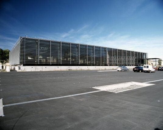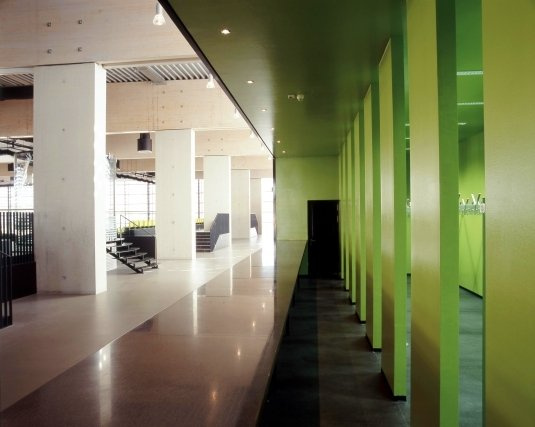 Das Bauwerk besitzt eine einfache, klare Form, beschränkt sich bewusst auf wenige Bauelemente. Auf einer in der Erde eingegrabenen Betonwanne sitzt ein Glaskörper, der umlaufend mit einer verstellbaren Metall-Lamellen-Konstruktion als Sonnenschutz versehen ist. Die Tragstruktur der Halle aus Sichtbetonstützen und Brettschichtholzbindern wird kombiniert mit den farbigen Oberflächen der Böden und Wände.