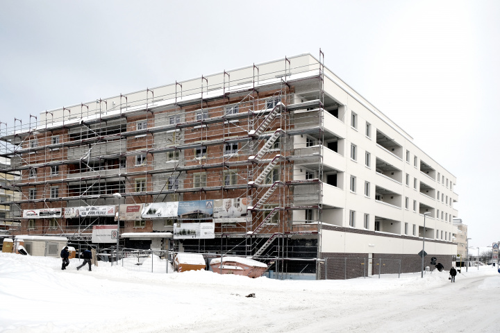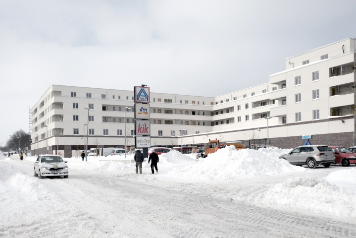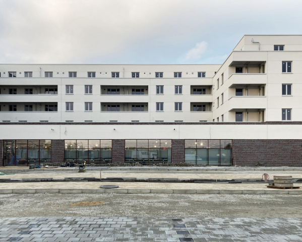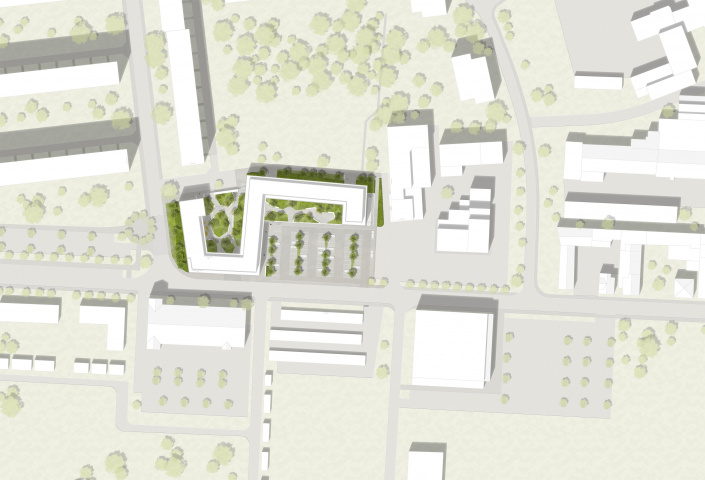 An der Schnittstelle von Gründerzeitbebauung, Gewerbebau und Plattenbaustrukturen vermittelt der neue mäanderförmige Stadtbaustein zwischen den unterschiedlichen Kontexten. Als Schwerpunkt des Quartierszentrums bildet er den neuen Auftakt für das Wohnquartier Weimar Nord. Drei Einheiten für den Einzelhandel bilden den Sockel. Das 1.OG beherbergt Pflege-Nutzungen, umspielt von zwei großzügigen Dachterrassen, die allen Bewohnern attraktive und geschützte Außenräume mit Blick über die Stadt und ins Grüne bieten. Laubengänge bieten Raum für Kommunikation und ermöglichen eine optimale Belichtung und Belüftung der Service-Wohnungen in den Obergeschossen. Der rote Backstein und der helle Putz nehmen bewusst Bezug auf die früheren Gewerbebauten und die Anfänge des Plattenbaus an diesem Ort.