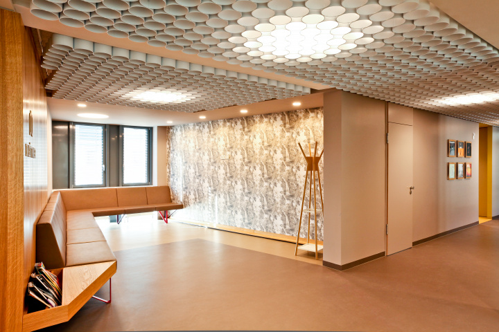 Eine Profilglaswand als Abtrennung zu den Untersuchungsräumen trägt zum weiteren Tageslichteintrag bei, alles wirkt dadurch hell und luftig. Die eingesetzten Materialien und Oberflächen brechen mit dem herkömmlichen Bild einer Praxis und zitieren Elemente zeitgenössischen Wohnens.