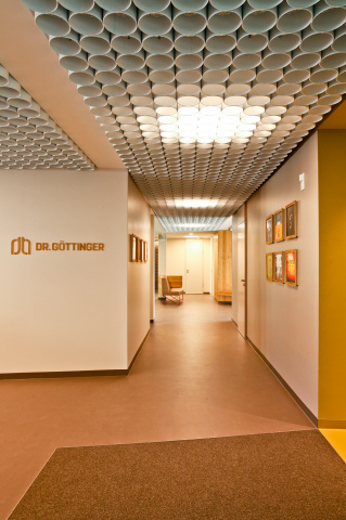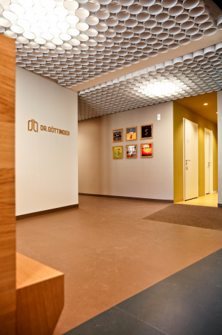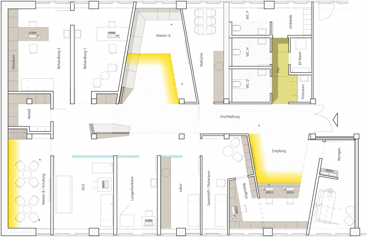 Für den Umbau der Praxis Dr. Göttinger wurde eine vormals als Büro genutzte Einheit entkernt und neu gestaltet. Zwei neue, offene Grundrissbereiche stoßen vom Erschließungsflur zum Tageslicht der Fassaden durch und nehmen die wichtigen Bereiche Empfang und Warten auf.