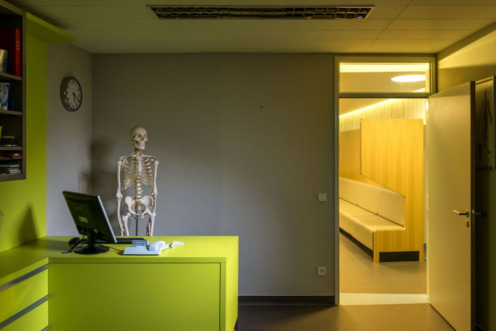Für den Umbau der Praxis für Orthopädie Sportmedizin Erfurt wurde eine vormals als Büro genutzte Einheit entkernt und neu gestaltet. In Zusammenarbeit mit Herrn Schmidt (herrschmidt architektur) – verantwortlich für die Innenraumgestaltung – entstand so eine Raumstruktur, welche exakt auf den Arbeitsablauf der Praxis abgestimmt ist. Durch weiche geschwungene Wände sowie eine wohnungsartige Möblierung wird eine Leichtigkeit erreicht, die den Patienten den Aufenthalt so angenehm wie möglich gestalten soll. Das Lichtkonzept unterstützt hierbei mit direktem und indirektem Licht die Raumabfolge und erhöht die Arbeits- und Aufenthaltsqualität.