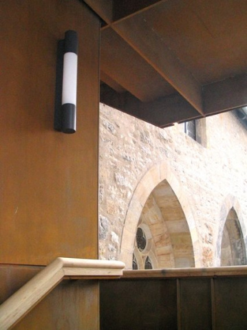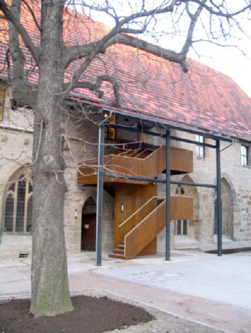 Die als Skulptur wirkende Stahltreppe erhält ihre charakteristische rostrote Färbung durch Einsatz des wetterfesten CORTEN-Stahls, dessen oberflächlich entstehende Rostschicht tiefergehende Korrosion verhindert. Sie wurde unter Berücksichtigung der historischen Wandöffnungen konzipiert.