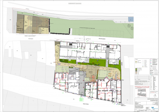 Der Rückwertige Teil der Grundstücke an der Brauhausgasse lag brach bzw. war mit Wirtschaftsgebäuden der Vorderhäuser an der Breiten Straße bebaut.