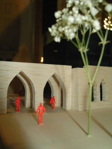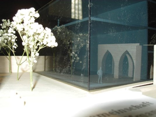 Die historischen Mauerreste bilden somit die Umrahmung der Neubauten. Die Neubauten werden auf Plateaus errichtet, die über den Grundmauern zu schweben scheinen. Die bauliche Distanz zum Bestand ist Teil des Konzeptes. Die Höhenentwicklung der Neubauten wurde in Anlehnung an die angrenzende Bebauung vorgenommen. Durch die Nichtbebauung der nördlich vom Veranstaltungsbau liegenden Freifläche entsteht ein maßstäblicher Platz, welcher die historische Eingangssituation betont.