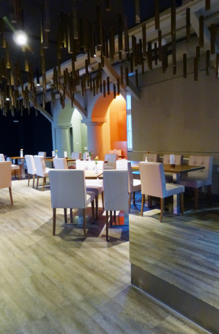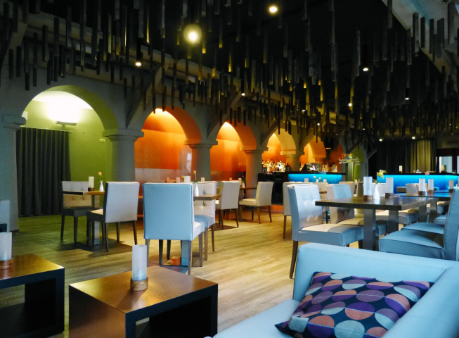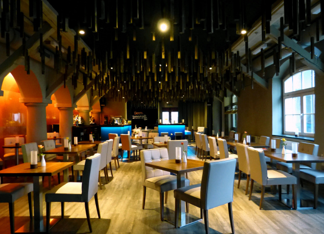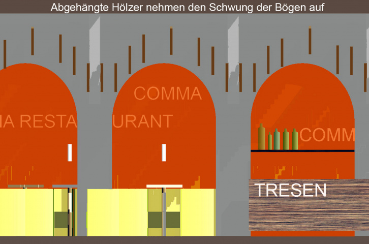 Aufgabe war, dass im Erdgeschoss des traditionsreichen Veranstaltungshauses liegende Restaurant durch ein modernes Konzept zu beleben. Besucher der Veranstaltungssäle im Obergeschoss mussten den Gastraum queren. Es erfolgte eine Neustrukturierung des Raumes und der Wegebeziehungen. Ein Gartenbezug wurde geschaffen. Der Besucher wird nun seitlich des Gastraumes geführt, erhält aber einen Einblick in diesen. Ein besonderes Highlight findet man an der Decke. Gebeizte Hölzer scheinen im Raum zu schweben. Die "Commas" erzeugen eine neue, organische Ebene, welche den Schwung der vorhandenen Bogenwand aufnimmt. Holz und Kupfer als Materialien sorgen für den besonderen Eindruck. Wichtig war den Betreibern, das alte Flair grundlegend zu verändern. Das "Comma Gera" ist in Bewegung gekommen.