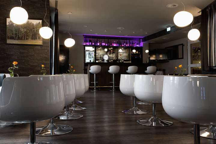 Die Aufgabe in der Überarbeitung des Gastronomiebereichs bestand darin, Wegebeziehungen zu optimieren und eine adäquate Entréezone zu schaffen. Im Zentrum des Geschehens sollte eine Bar und ein Buffet installiert werden, um diese Zone gliedern sich der Küchentrakt, die Bowlingbar, das Restaurant und der grosze Saal. Zur Entschleunigung wurde der Eingangsbereich völlig überformt, so dass ein Windfang und eine neutrale Zugangssituation für Gäste über den Straszenzugang entstand. Als erstes empfängt die die Bar die Hausgäste dieser Funktionsbereich dient der Bewirtschaftung der Restaurants des Saals. Vor der Bar ist eine Loungezone als Warte- und Aufenthaltsbereich installiert worden. Über eine groszformatige Tür gelangt man in den Saal. Die minimale Raumhöhe stellte hier gröszte Anforderungen an die Entwurfsplanung. Es wurde angestrebt die gefühlte Raumhöhe zu maximieren und dabei alle Medienanschlüsse in der Decke zu verziehen. Die Lösung besteht in der Ausbildung von sechs Kassetten, welche eine indirekte Beleuchtung aufnehmen und von mittig angeordneten Pendelleuchten mit Innenstuck die atmosphärische Illumination übernehmen. Die Pendelleuchten sind in Dreierreihen gehangen und bilden über eine gedachte Bogenlinie ein Gewölbe aus. Die Wand- und Deckenfarben sind so aufeinander abgestimmt, dass zwei grundlegend divergierende Raumeindrücke tageszeitabhängig entstehen. Bei der Möblierung wurde viel Wert auf das Regionalprodukt Holz gelegt, die Aufpolsterung kontrastiert das Holz mit weichen vertikalen Linien in einem hellen Tuch. Um den Behaglichkeitsaspekt in groszen Räumen zu verbessern wurden zwei Kamine installiert. Die Schmalseite gegenüber dem Eingang erhielt eine raumübergreifende und raumprägende Kaminskulptur. Der hofseitige Wandbereich wurde ebenfalls mit einem Kamin aufgewertet. Im Gegensatz zum Saal wurde in den beiden Restaurants viel Wert auf introvertiertes sitzen gelegt. Die Tische sind in kleine Kabinen eingesetzt, lassen sich aber auch variabel für Feste zu einer groszen Tafel arrangieren. In den Marteialitäten wurde hier viel mit holzoptiken gearbeitet welche mit erdigen Tönen im Wand und Deckenbereich auf edlen Strukturtapeten harmonieren. Ein wesentlicher Entwurfsaspekt war die Illumination dieser Bereiche, da ein nicht unbedeutender Teil der Restaurants im Gebäudeinneren liegt. Durch ein ausgewogenes Arrangement von Wandleuchten und skulpturalen Deckenleuchen und Lichtbändern konnte eine hohe Aufenthaltsqualität erzielt werden. Die Bowlingbar zielt auf ein junges und junggebliebenes Publikum ab, aus diesem Grund wurde der Gestaltungsfokus auf eine spacige Raumgestaltung abgestellt die sich deutlich von den anderen Bereichen abgrenzt ohne ihnen jedoch fremd zu sein. Die Wandbeläge wurden in Beton- und Schieferoptik ausgeführt und mit Holz kontrastiert. Die Einrichtung hingegen liegt im Stil der 70er Jahre in Kuststoffsesseln und Loungetischen sowie weiszen Kieselsteinleuchten.