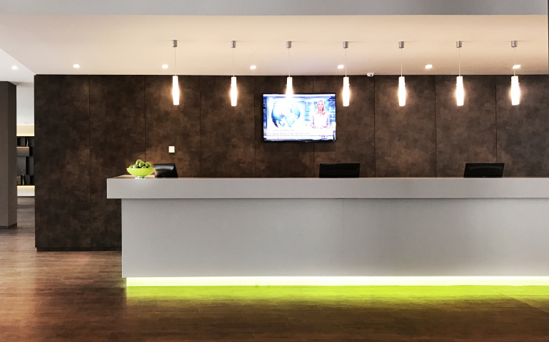 - Lobby, Rezeption, Frühstücksraum, Vorbereitungsküche und Räume der Hotelverwaltung