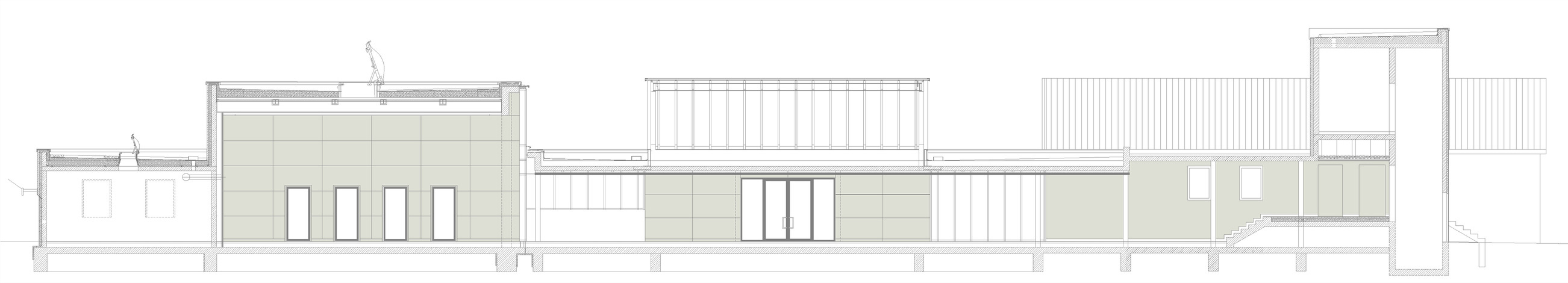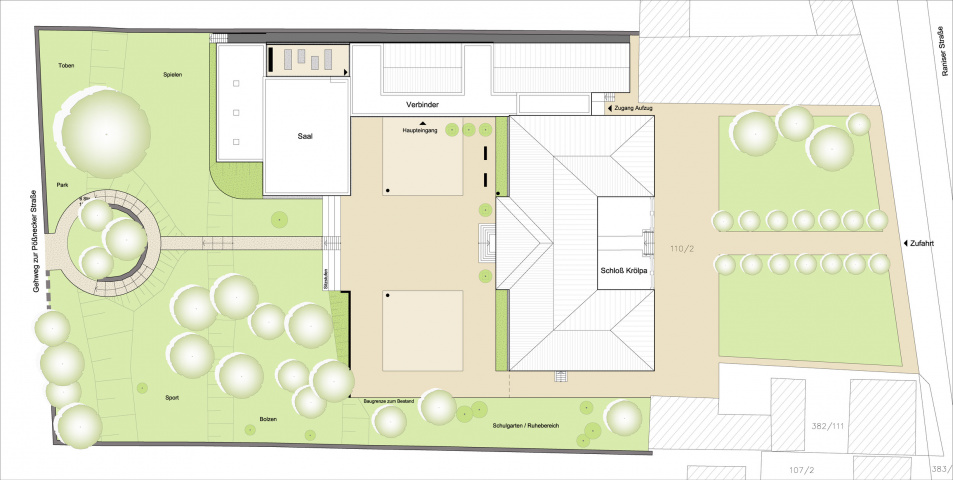 Der neue Saal im Park des Schlosses bildet eine Raumkante des Schulhofes bzw. des öffentlichen Platzes. Er definiert den alten Ort neu, berücksichtigt dabei aber die Denkmalwerte von Schloss und Parkmauer.