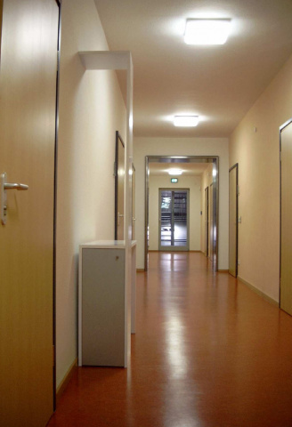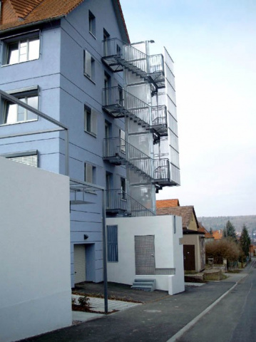 Sanierungskonzeption: Der notwendige 2. Rettungsweg wurde durch eine Fluchttreppe am Nordgiebel geschaffen. Diese Fluchttreppe aus Stahl wurde als ordnendes und gestaltendes Element genutzt. Sie gliedert den Gebäudegiebel, verbessert die Maßstäblichkeit der Fassade zur Strasse und zur Stadt und mildert die erheblichen gestalterischen Defizite des Gebäudes.