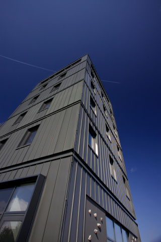 Fassadendetail Stehfalzverblechung aus vorbewittertem Zinkblech, Bild: Axel Bauer -