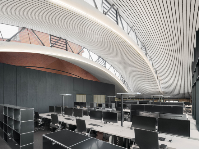 So konnte ein besonders innovativer Ansatz als Neuinterpretation des Industrie-Sheddaches im Bogenverlauf der historischen Ziegelschildgiebels verfolgt werden. Für das Dach wurde einheimisches Fichtenholz tragend und gestaltend eingesetzt.