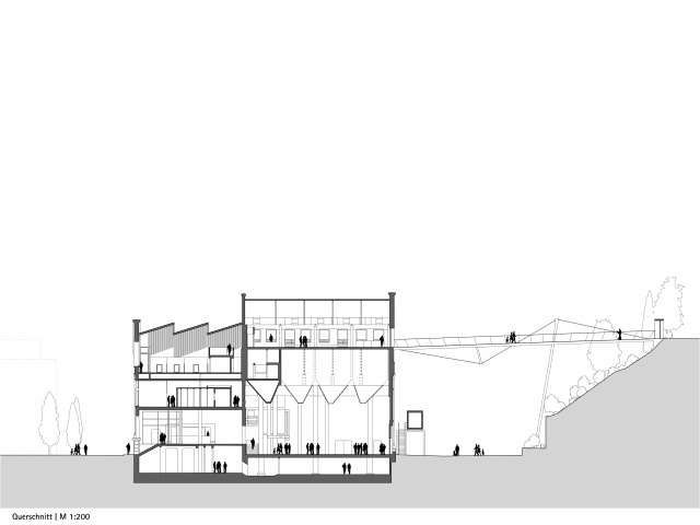 Ein Erweiterungsbau erweitert die bereits gebundene Graue Energie der Bausubstanz durch eine tageslichtgeflutete Gebäudefuge, die Zäsur zwischen Neu und Alt darstellt, gleichzeitig den urbanen Charakter der Baumasse stärkt, die ergänzenden Treppenhäuser errichtet und die thermische Hüllfläche des Bestandes reduziert. Die wechselseitige Kulisse von Bestand und galerieartiger Situation ist ein besonderes Erlebnis um die Dimension des Treppen- und Wegraumes zu erfahren.