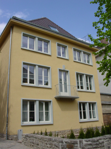 Das Gebäude aus den 30-er Jahren ist Bestandteil einer aus 3 Einzelhäusern bestehenden Wohnanlage und soll dem entsprechend wieder als Ensemble wirken. Neben der dem denkmalgerechten Anspruch an die Planung sollte hier auch durch weitere energetische Maßnahmen ein hochwertiges Gebäude entstehen. Mit den geplanten Einzelmaßnahmen Innendämmung, Zellulosedämmung im Dach, hochisolierte Fenster und einer Gasheizung mit Brennwerttechnik konnte der energetische Standard deutlich verbessert werden. Gleichzeitig ergab sich dadurch die Möglichkeit günstige KfW-Darlehen in Anspruch zu nehmen.