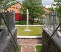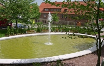 beckens ziert eine mittelhohe Fontäne, die als Besonderheit raumprägend wirkt. Die schon in Teilen bestehende Baumellipse wurde durch neue Baumpflanzungen ergänzt. Unterstützend ist in der geometrischen Form der Platanen-Ellipse ein gepflasterter Sitzbereich mit Zweisitzern und Einzelsitzen eingeordnet worden.