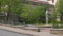 Sträuchern und Bodendeckern räumlich gefasst worden. Der sich vor dem Mahnmal erstreckende wassergebundene Platz bündelt die zahlreichen Wegeverbindungen in sich. Die gesamte Anlage ist zu einem Aussichtspunkt angehoben worden und wird durch eine Natur-steinmauer, die gleichzeitig beide Freiräume voneinander trennt, gestützt. Die Verbindung beider Geländeniveaus erfolgt durch einen wassergebundenen Weg und durch eine Treppenanlage. Beim Mauerneubau wurden die historischen Details (Handwaschbecken) eingearbeitet.