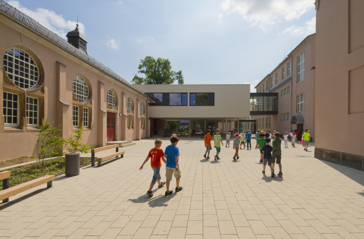 baurechtlichen Anforderungen erfüllt und das Raumprogramm einer dreizügigen Grundschule mit Freiflächen für Hort, Schulgarten und Sport umgesetzt werden. Mit den Neubauten wurde ein in sich verbundener Schulkomplex geschaffen. Über den neuen Haupteingang sind der Verwaltungsbereich, die Speiseversorgung und die Unterrichtsräume im Hauptgebäude angebunden. Im Obergeschoss des Neubaus befinden sich die Horträume. Durch das zum Teil aufgelöste Erdgeschoss des