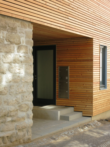 Als Ergänzung entstand entlang der Brauhausstraße ein Neubau, der den spätromanischen Profanbau überdeckt. Der Neubau setzt sich in Material (Holzkonstruktion) und Architektursprache vom Bestand ab. Auch im Neubau ist eine Wohnnutzung (3-4 Wohneinheiten) geplant.