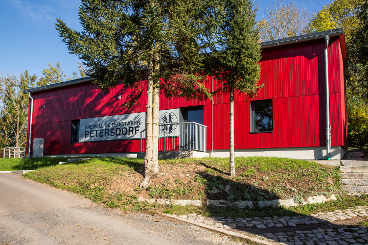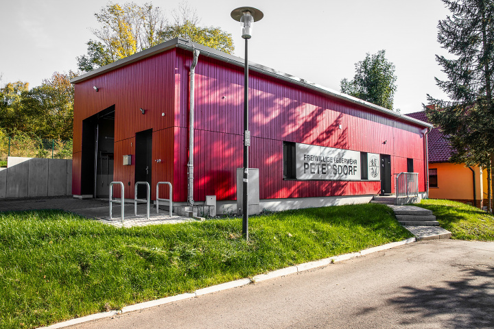Im Zuge der Baumaßnahme erfolgte eine vollständige Grundsanierung mit Überformung des Bestandes und dessen Erweiterung mit einem Anbau für einen zusätzlichen Stellplatz. Weiterhin wurden in dem Bestand neue Umkleide- und Waschräume geschaffen für die Kameraden der Feuerwehr. Der Gebäudekomplex erhielt eine neue Pultdachkonstruktion, neue Tore und eine Holzfassade, dessen Gestaltung und Architektur sich einfügt in das dörfliche Umfeld von Petersdorf.