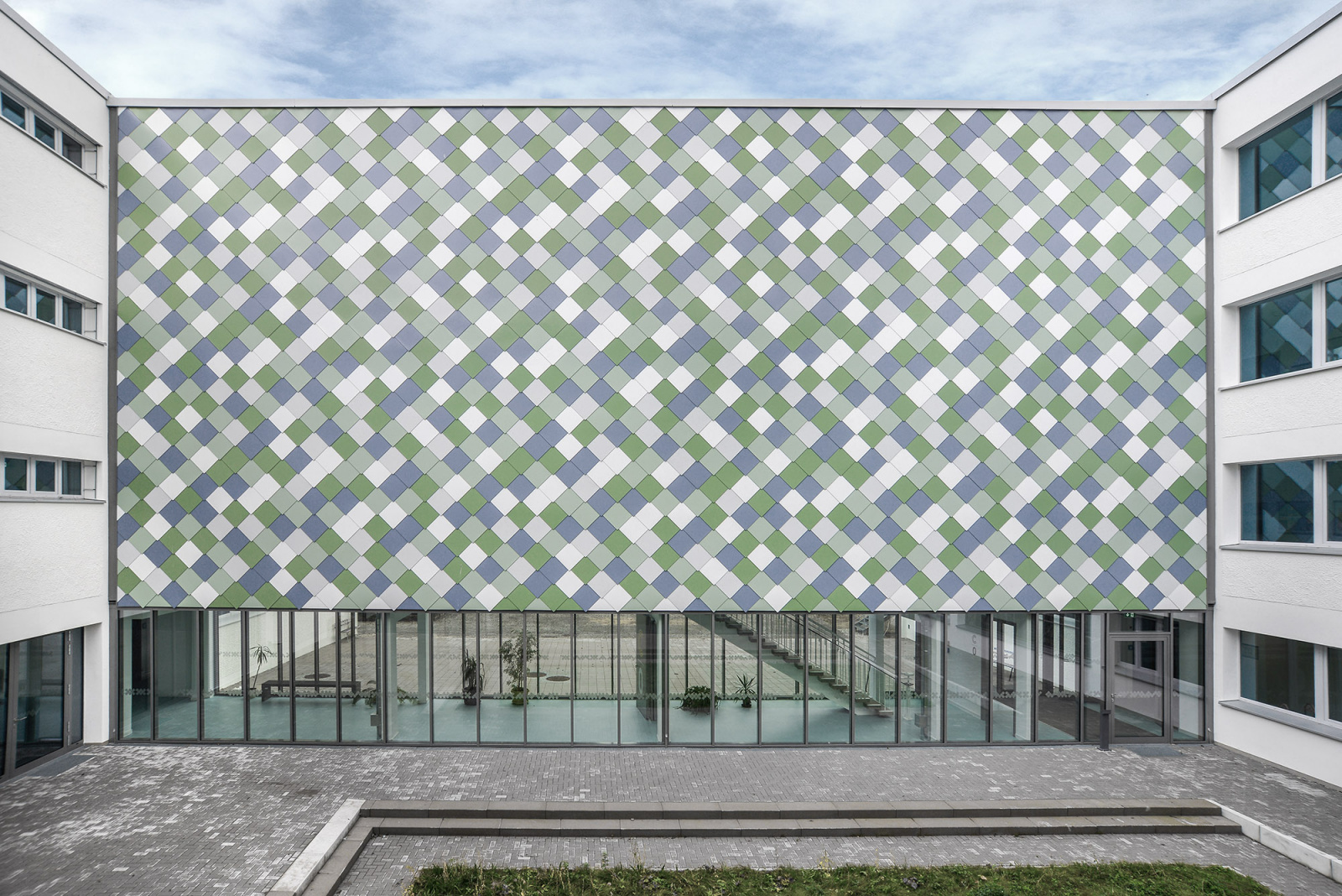Das Bestandsgebäude wurde in den 60-er Jahren als Typenprojekt in Montagebauweise errichtet. Es besteht aus zwei, sich gegenüberliegenden, 4-geschossigen Gebäuderiegeln, welche über drei Verbindungsbauten miteinander verbunden sind, wodurch zwei 4-seitig und zwei 3-seitig umschlossene Innenhöfe ausgebildet werden. Entsprechend den Anfor-derungen an eine zeitgemäße Schule ist die Erweiterung des Bestandsgebäudes um einen Mehrzweckraum und Mensa notwendig. Dieses Bauvolumen wird im südlichen, „ersten“ Innenhof als eingeschossige Überbauung geplant. Die Raumstrukturen im Gebäudeinneren bleiben größtenteils erhalten und werden nur in wenigen Bereichen durch Abbruch von Be-standswänden und Ergänzung neuer Wände verändert. Bei der neuen Fassadengestaltung wird die Optik der Bestandsstruktur aufgegriffen und neu interpretiert. Die Vorhangfassaden auf gestalten sich in einem schuppenartigen, mehrfarbigen Muster, welches im Farbspekt-rum vom Thüringer Wald Anlehnung findet.