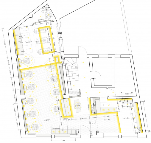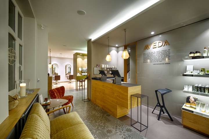 Die Verdrehung wird im Inneren auf alle Ausbauelemente (Möbel, Lichtvouten, Decken, Fußboden usw.) übertragen und verbindet sich zu einer dynamischen Gestaltungslinie. Diese gliedert den Grundriss in eine Empfangs- und Wartezone mit angeschlossenem Retail sowie den Bereich der Schnitt- und Waschplätze.