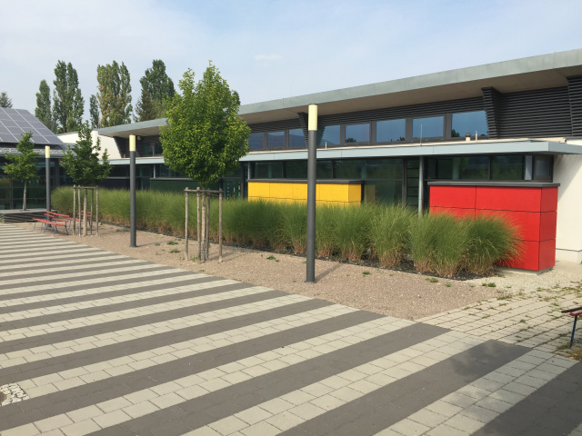 Ein mit Bambus bepflanzter Innenhof für die kleinen Pausen, ein veritabler Schulgarten mit Gemüse und Obst, das in der schuleigenen Küche verarbeitet werden kann sowie eine Bewegung fördernden Schulhof mit Hügeln und grünem Klassenzimmer konnte 2010 übergeben werden. Photovoltaikanlage und Regenwassernutzung zeigen, dass die Stadtverwaltung mit diesem nachhaltigen Ansatz neue Wege gehen will.