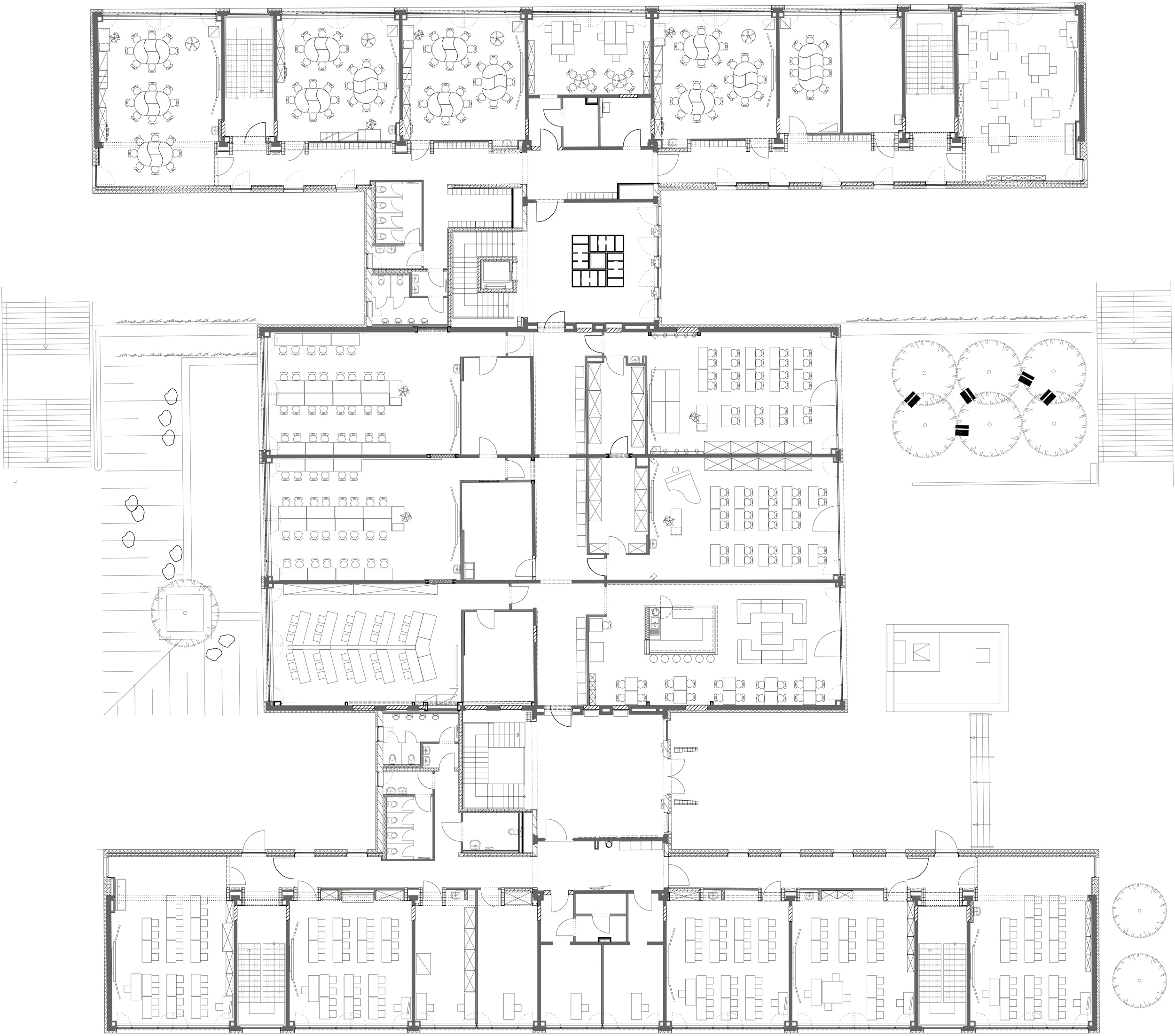 Der 1972 erbaute, aus drei in H-Form angeordneten Gebäudeteilen bestehende Plattenbau in der Karl-Marx-Allee in Jena wurde komplett saniert und umgebaut, um den drei sehr unterschiedlichen Schulformen mit insgesamt bis zu 1000 Schülern optimale Lernbedingungen zu bieten. Zur Orientierung wurden sowohl im Gebäude als auch an der Außenfassade die Identifikationsfarben der Schulen verwendet. Durch den Anbau von neuen, in Sichtbeton ausgeführten Erschließungsgängen erhielt das Schulzentrum eine vollständige innere Erschließung. Östlich des Schulgebäudes wurde für alle Schulen eine 2-geschossige Aula mit einem 200 m² fassenden Veranstaltungs- und Mensasaal erbaut. Zudem wurde das gesamte Gebäude energetisch saniert. Die obere Dachfläche wurde vollständig mit Photovoltaik-Elementen belegt und erzeugt, ersichtlich für die Schüler über ein Display im Eingangsbereich, ökologischen Strom. Die Dachflächen im Sichtbereich des Nutzers sind als Gründächer mit extensiver Begrünung ausgeführt.