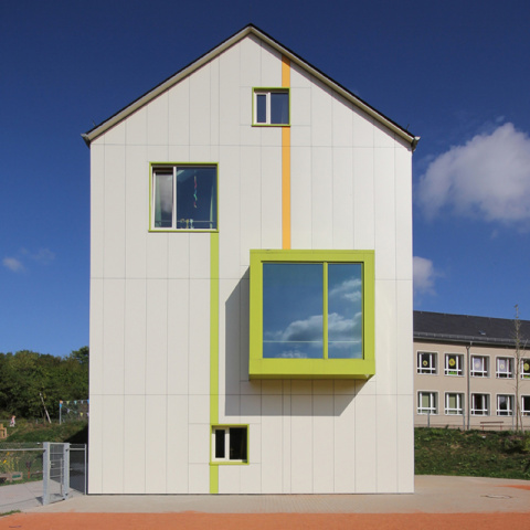 Im Rahmen der Komplexsanierung des Schulzentrums Leutenberg wurde neben der Grundschule mit der Einordnung der Kindertagesstätte „Zwergenparadies“ ein integratives Lern- und Betreuungskonzept für Kinder von 1-10 Jahren realisiert. Synergieeffekte ermöglichen eine funktionale Aufwertung und Stärkung des Standorts und befördern das Zusammenwachsen beider Einrichtungen. Architektur und Funktion treten in ein kindgerechtes Wechselspiel hinsichtlich fließender Übergänge von Innen- und Außenraum, Fensteröffnungen und Fassadenstruktur, Erlebbarkeit unterschiedlicher Natur- und Stadtansichten im Landschaftsraum Leutenberg.