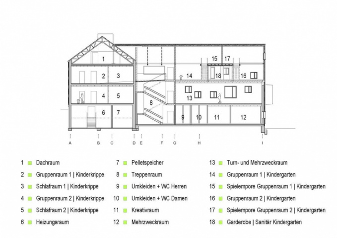 Kindgerechte Klein- und Rückzugsräume wie Emporen, Galerien und Ausstellfenster sichern eine interessante Spiel- und Erlebnisvielfalt im Gebäude.