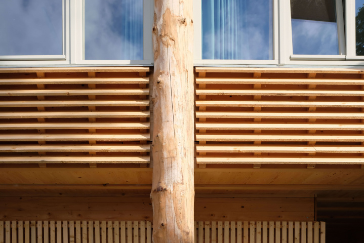 Erweiterungsflügel, Seeseite: Baumstützen aus Lärchenholz, Stülpschalung aus Fichte, Rauspund, Nichtsichtqualität, Bild: Laura Fogarasi-Ludloff -