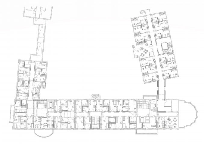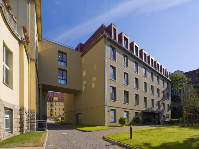 Für das unter Denkmalschutz stehende historische Pflegeheim an der Arnstädter Straße bedurfte es Mitte der 2010er Jahre einer erneuten Beschäftigung mit seinem baulichen Zustand und inneren Strukturen. Insbesondere das Fehlen der eigenen Bäder für jeden Bewohner, fehlende moderne Wohngruppenstrukturen und die notwendige Anpassung der Haustechnik an gestiegene technische Anforderungen, machten eine Sanierung und Umstrukturierung des Hauses erforderlich. Mit der Idee: „Aus drei Zimmern, mach Zwei mit Bad.“, verbesserte sich der Standard im Bestand erheblich, erforderte jedoch eine Kompensation der wegfallenden Zimmer. Mit dem Erweiterungsneubau konnte die Kapazität des Hauses von insgesamt 168 Pflegeplätzen gehalten und neue Strukturen in der Pflege, für das ganze Haus, ermöglicht werden.