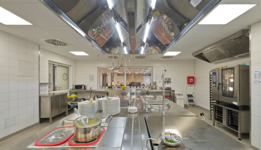 Herzstück und Treffpunkt ist das große Restaurant im Erdgeschoss. Hier können die Bewohner*innen aber auch Personal und Gäste an der Zubereitung des Essens teilhaben. Große Fenster in die Vollküche ermöglichen den wichtigen Kontakt zwischen Küchenpersonal und Gästen. Ergänzt wird das ganze durch die Gemütlichkeit eines Kamins der gleichzeitig auch das Foyer „befeuert“.
