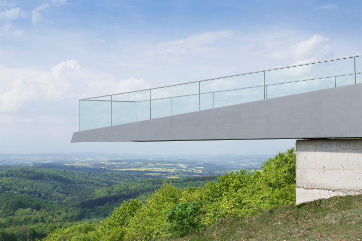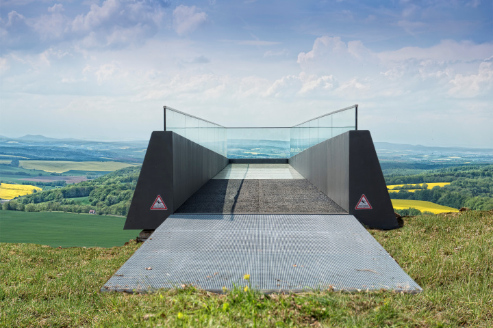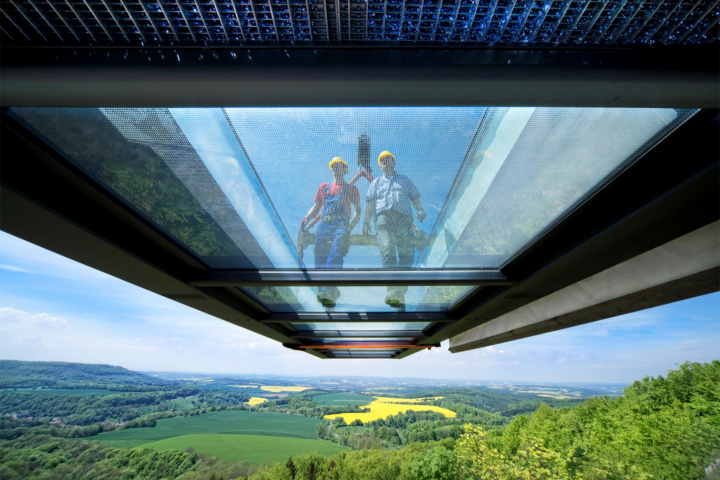 Skywalk Aussichtsplattform Sonnenstein Eins mit der Natur Das 486 Meter hohe Felsplateau des Sonnensteins ist einer der höchsten und besonders markanten Punkte im Eichsfeld. Er bietet einzigartige Ausblicke über den Eichsfelder Landschaftsraum bis hin zum Solling, zum südlichen Harz, zum Kyffhäuser, zu den Göttinger Gleichen, zum Ohmgebirge, zu den Bleicheröder Bergen und zur Goldenen Mark Duderstadt. Dem als Wahrzeichen des Berges bekanntem Stahlkreuz gesellt sich nun der neue Aussichtssteg hinzu. Er schiebt sich mit signifikanter Eleganz, Leichtigkeit und Klarheit in die stille Weite und Freiheit der Landschaft oberhalb der Baumwipfel und Klippen. Hier ist man völlig eins und verbunden mit der Natur. Vom am Bergfuß gelegenen Parkplatz führt ein bewusst schonend angelegter Pfad durch die verschiedenartige Flora des Gebiets. Dabei sensibilisieren Informationstafeln den Besucher für die ökologische Besonderheit dieser Landschaft, insbesondere für die flankierenden, sehr wertvollen Trockenrasengesellschaften. Der neue Aussichtssteg ist 13,4 Tonnen schwer, 14 Meter lang, 2,80 m breit und hat eine 5,2 Zentimeter starken Boden aus Verbundsicherheitsglas. Das massive Betongegengewicht an der Basis des Stegs sichert ihn im Fels. Die elegante Stahl-Glaskonstruktion besticht durch ihre Leichtigkeit und Eleganz. Ihre Formgebung folgt der Momentenlinie der statischen Belastung und entwickelt daraus ein bewusstes Spiel mit den Gefühlen derjenigen, die sie betreten. Der im Querschnitt u-förmig konstruierte Steg ist auf der Plateauseite voll erfahrbar, gibt Halt und Schutz. Je mehr man nach vorn über die Kante der Klippe schreitet, desto weiter sinkt die massive Brüstung ab und wird durch ein transparentes Glasgeländer ersetzt. In dem Maß, wie der massive Teil der Konstruktion nach vorn hin absinkt, entwickelt das transparente Geländer spiegelbildlich seine Höhe. Gleichzeitig löst sich der Boden unter den Füßen nach einigen Schritten sprichwörtlich auf. Man steht als Teil des großen Ganzen, frei mit sich selbst und seinen Gefühlen inmitten der Natur, mehr als 33 Meter über der Klippenkante sowie 100 Meter über dem Talgrund und scheint der Natur dabei noch ein kleines, vielleicht das entscheidende Stück näher gekommen zu sein. Die spezifischen Qualitäten des Glases, das für die begehbare Fläche eingesetzt wurde, mussten ganz besonderen Ansprüchen genügen: Faktoren wie Regen oder das Gewicht der zahlreichen Besucher, die zuvor im freien Gelände unterwegs waren und die Fläche nicht immer mit sauberen Schuhen betreten, wurden berücksichtigt. Hinter der technischen Lösung für den 5,2 Zentimeter starken Glasboden steckt die Firma Saint Gobain Glass. Zum Einsatz kam das begehbare Verbundsicherheitsglas SGG LITE-FLOOR, das ursprünglich für Fußböden und Treppenstufen im Innenraum entwickelt wurde und in diesem Fall aus vier, mit PVB-Folien verbundenen Glasscheiben besteht: Aus zwei Floatglasscheiben, einer teilvorgespannten Schutzglasscheibe und einer weiteren Schicht aus Float Schutzglas. Zusätzlich wurde die Verglasung mit einem siebgedruckten Raster versehen. Neben den rutschhemmenden Eigenschaften dieses Siebdruckrasters – und dadurch einem höheren Gehkomfort auf der Fläche – blieben trotz des zusätzlichen Gewichts auch die Tragkrafteigenschaften des Glases vollumfänglich erhalten. Gleichzeitig erhielt der gesamte Glasboden auf diese Weise einen höheren Bruchschutz. Auf dem Felsplateau ist bereits im vergangenen Jahr zusätzlich ein überdachter Verweilbereich, bestehend aus drei kreisrund angeordneten Sitzblöcken, überspannt von einer geschwungenen zeltartigen Konstruktion aus einem 3 mm Stahlblechtuch, geschaffen worden. Der neue Aussichtssteg und die Figur eines Riesen, der seinen Schuh auskippt, runden nun die neue Attraktivität eines der besonderen Ortes des Eichsfelds ab. Der Sage nach soll der Riese bei seiner Rast hier seinen Schuh ausgeleert und dabei den als Brauner Bühl bekannten Berg auf der gegenüberliegenden Seite kegelförmig aufgeschüttet haben. Steht man auf dem Fundament des Kreuzes, kann man dieses Schauspiel jetzt bildlich nachvollziehen, was aber nicht nur für Kinder ein Highlight ist. Der neue Aussichtssteg auf dem Sonnstein macht die Schönheit und Einzigartigkeit der Landschaft des Eichsfelds in beeindruckender Weise nachhaltig erfahrbar. Er wird künftig mit Sicherheit eine der großen Touristenattraktionen in der Umgebung werden und viele interessierte junge und alte Besucher von nah und fern immer wieder anlocken.